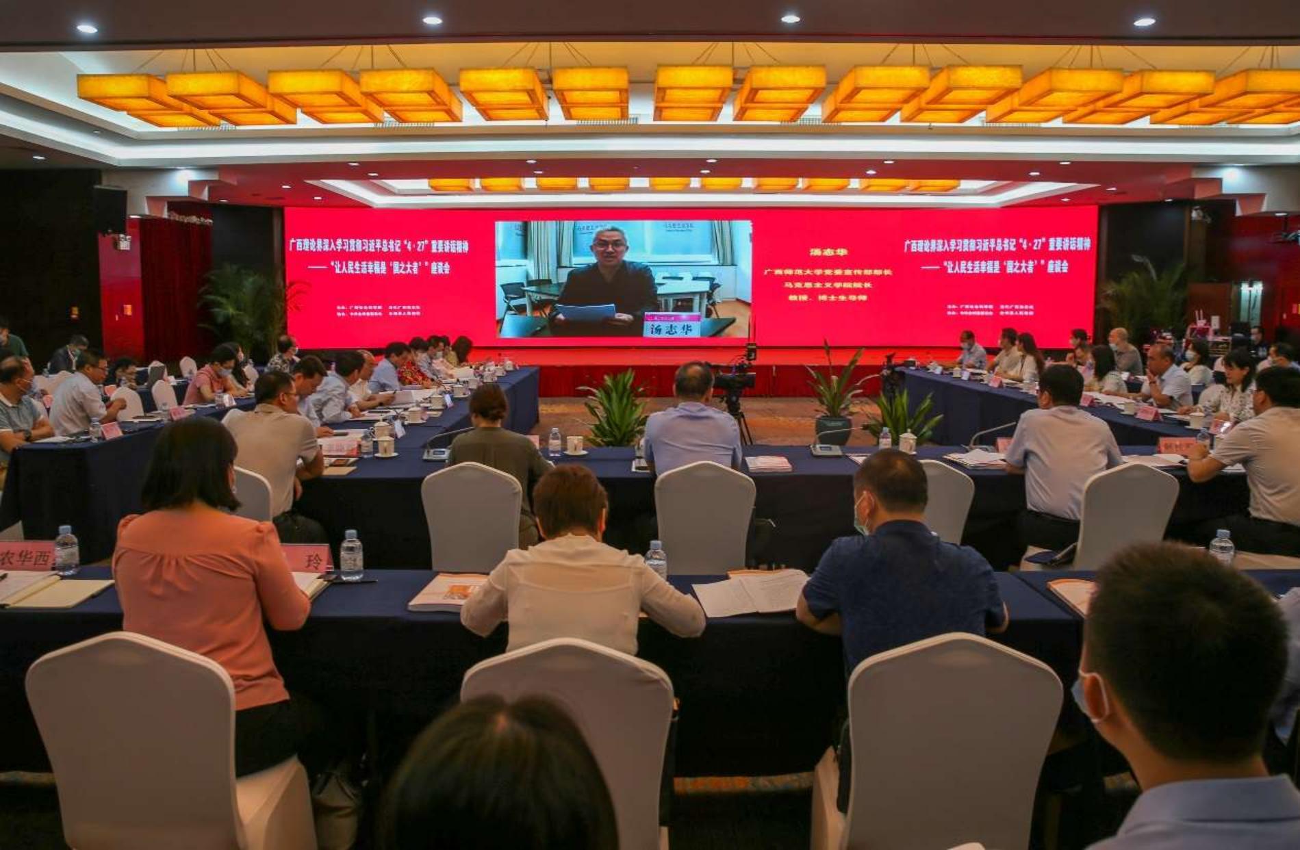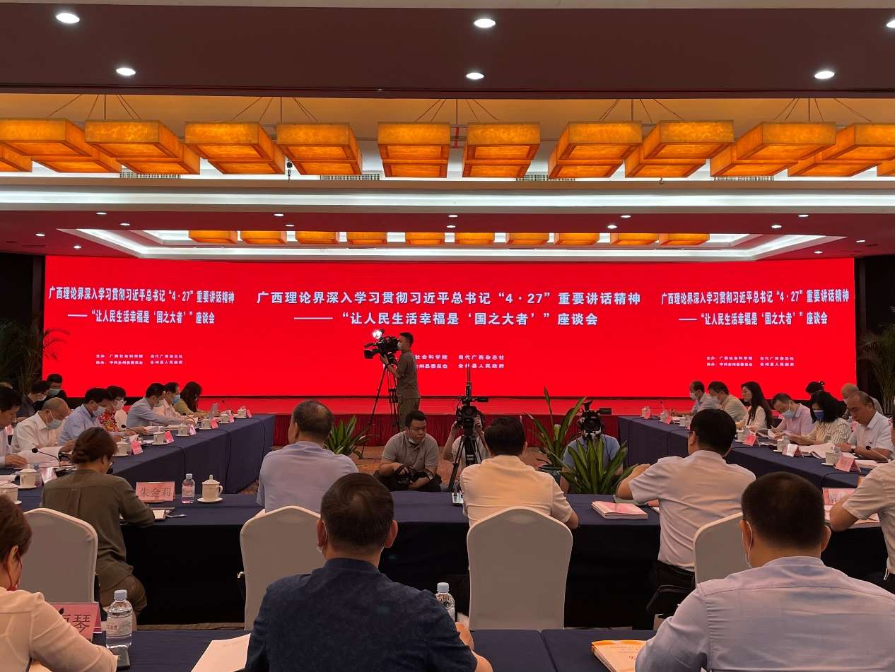 4月24日,广西理论界以“让人民生活幸福是‘国之大者’”为主题,分别在南宁和桂林全州县召开座谈会。广西区内高校太阳成集团122ccvip、党校(行政学院)、干部学院、科研院所的专家学者代表80多人出席了会议。广西壮族自治区党委宣传部副部长赵勇富在主会场出席会议并致辞。当代广西杂志社社长、总编辑刘波主持主会场会议。
