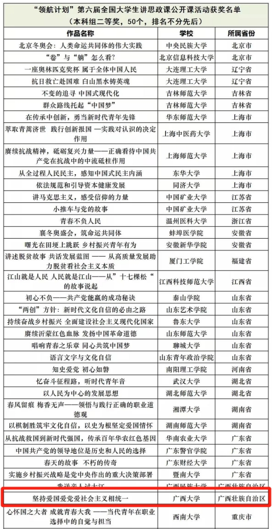 据悉,全国高校大学生讲思政课公开课展示活动是教育部组织开展的习近平新时代中国特色社会主义思想大学习领航计划系列主题活动之一,本次活动共评选出本科组二等奖50名。
