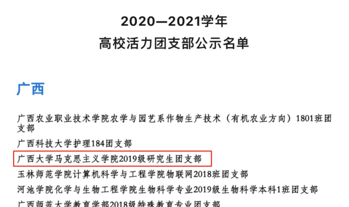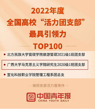 为深入贯彻“全团抓思想政治引领”、“全团大抓基层”、“全团抓学校”工作部署,落实《关于改革创新高校共青团工作 切实增强思想政治引领实效的若干措施》,激发高校团支部活力,团中央基层建设部指导中国青年报社开展2022年度高校“活力团支部”风采展示活动。我院2020级研究生团支部荣获2022年度全国高校“活力团支部”最具引领力TOP100榜。我院2019级研究生团支部在2020-2021学年也入选高校“活力团支部”,学院连续两年有团支部获评全国高校“活力团支部”!