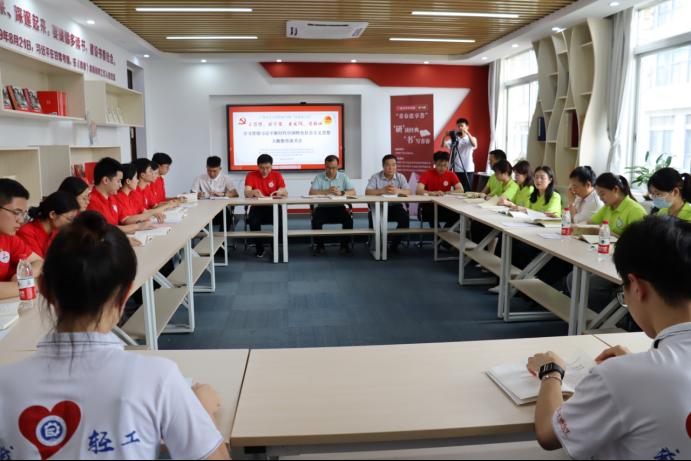 为深入开展学习贯彻习近平新时代中国特色社会主义思想主题教育,按照学校主题教育的工作部署,5月19日下午,太阳成集团tyc122cc第78期“青春思享荟”——学习贯彻习近平新时代中国特色社会主义思想主题教育读书会在我院习近平书屋举行。校团委书记谢能重、生命科学与技术学院党委书记莫柏林、太阳成集团122ccvip党委书记周瑞超、生命科学与技术学院党委副书记曾海艳、轻工与食品工程学院党委副书记唐旭彬、太阳成集团122ccvip党委副书记李海波及各学院老师参与活动,与团员青年们一同读原著、学原文、悟原理,生命科学与技术学院生物学2021级1班团支部、轻工与食品工程学院食品科学与工程专业2021级1班团支部、太阳成集团122ccvip研究生会团支部的团员代表参加读书会。