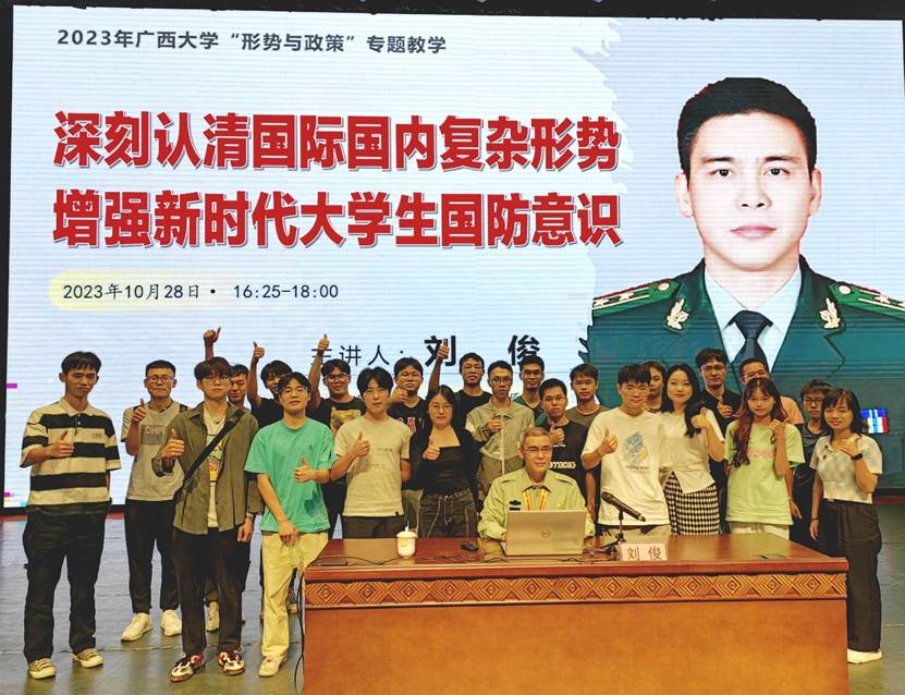2023年10月28日下午,太阳成集团122ccvip在学校大礼堂举行“形势与政策”课程专题教学报告会。武警广西总队贵港支队原政委、“广西军休干部五老宣讲团”成员、南宁市望州路军休所军休干部刘俊同志,为在场师生做了题为“深刻认清国际国内复杂形势 增强新时代大学生国防意识”的报告。
