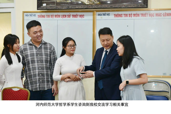 此外,我院教师代表团还访问了越南河内师范大学,与河内师范大学国际教育学院签署了合作备忘录。河内师范大学校长阮文明教授亲临现场并发表讲话,对代表团的到访表示高度重视和热烈欢迎。双方表示今后将在承接全国高校思想政治理论课教师国际实践研修、加强科研合作、联合举办国际学术研讨会、教师互访研学、研究生和本科生联合培养等方面开展合作,进一步促进双方高校教育国际化水平。该校国际教育学院院长黎辉北教授、哲学系主任阮维然博士等出席签字仪式,随后代表团还与哲学系师生代表进行了座谈交流。