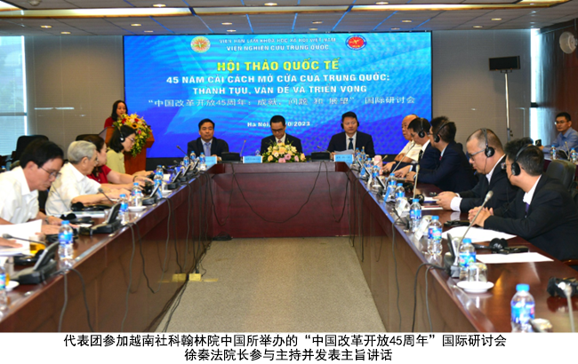 在越期间,徐秦法教授率团参加了在越南社会科学翰林院中国研究所举办的以“中国改革开放45周年:成就、问题和展望”为主题的国际学术研讨会。本次会议吸引了中越两国学者的关注和参与,我院徐秦法、王承就、清华大学马克思主义韩冬雪、南宁师范大学宁德鹏等多位教授应邀发言,并回答了越南专家关心的有关学术提问。