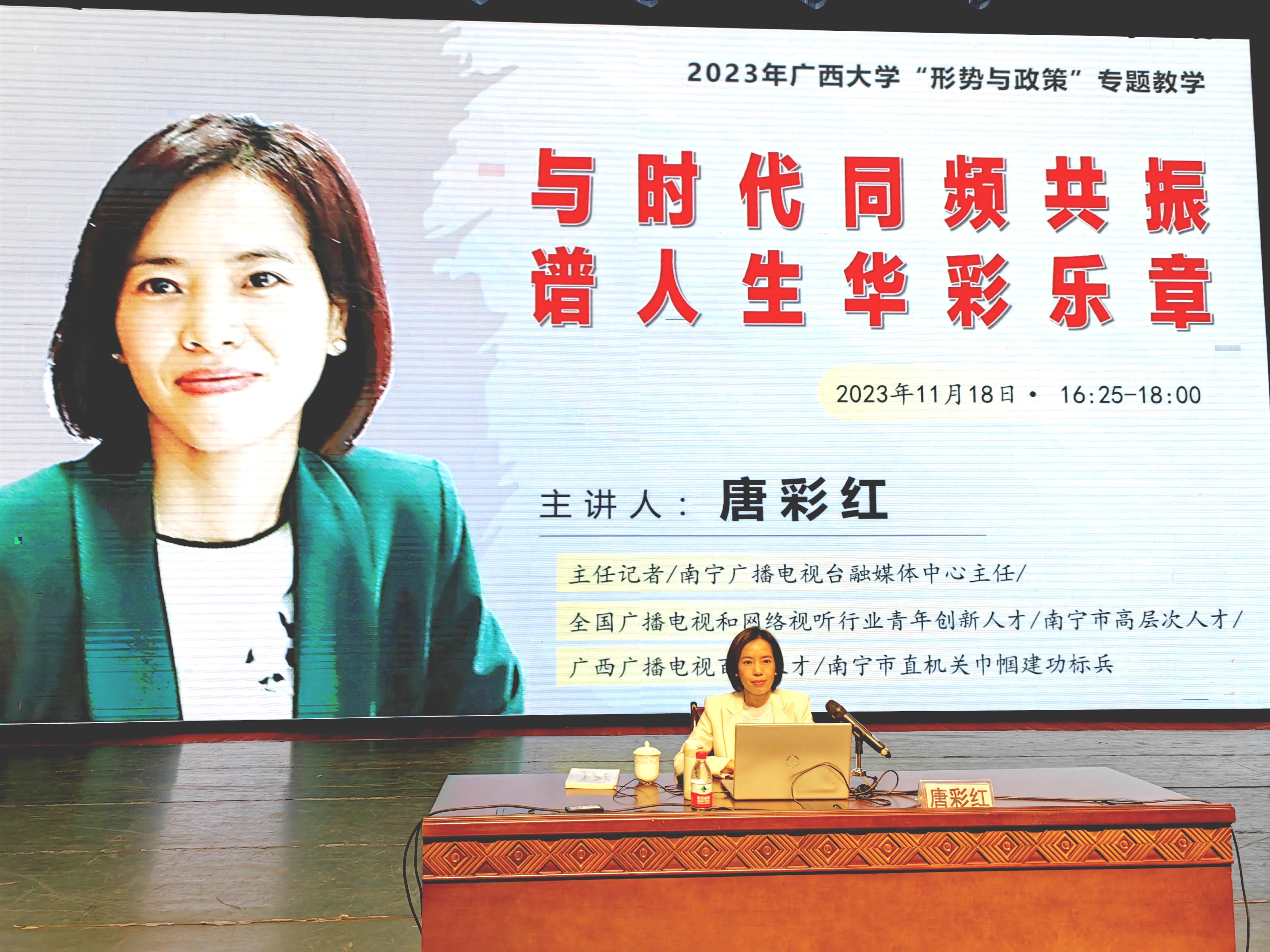 2023年11月18日下午,我校大礼堂举行了“形势与政策”课程专题教学报告会。南宁广播电视台融媒体中心主任、南宁市委讲师团特聘专家(教授)唐彩红主任记者为到场师生做了题为“与时代同频共振 谱人生华彩乐章”的报告。