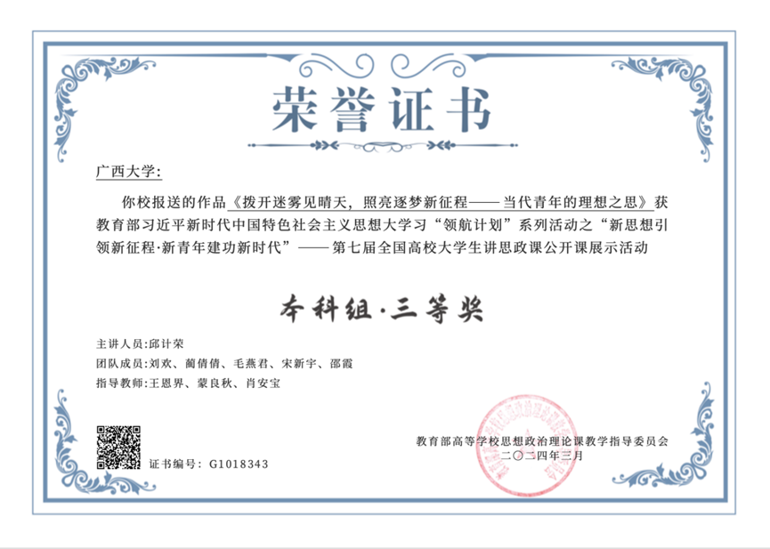 我院选送作品《拨开迷雾见晴天,照亮逐梦新征程——当代青年的理想之思》荣获本科组三等奖,该作品由王恩界、蒙良秋、肖安宝老师指导,邱计荣主讲,团队成员为刘欢、蔺倩倩、毛燕君、宋新宇、邵霞。