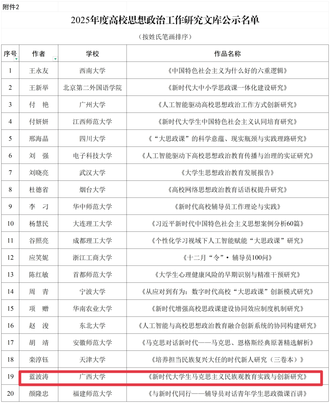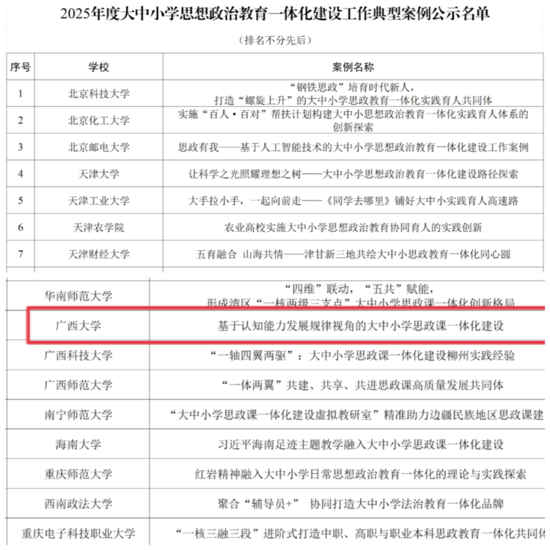 近日,教育部公布了2025年度高校思想政治工作质量提升综合改革与精品建设项目遴选结果,我院共有3个项目成功入选。其中,《新时代大学生马克思主义民族观教育实践与创新研究》入选2025年度高校思想政治教育工作研究文库,《基于认知能力发展规律视角的大中小学思政课一体化建设》入选2025年度大中小学思想政治教育一体化建设工作典型案例,“礼润小西”辅导员工作室入选2025年度高校辅导员名师工作室。