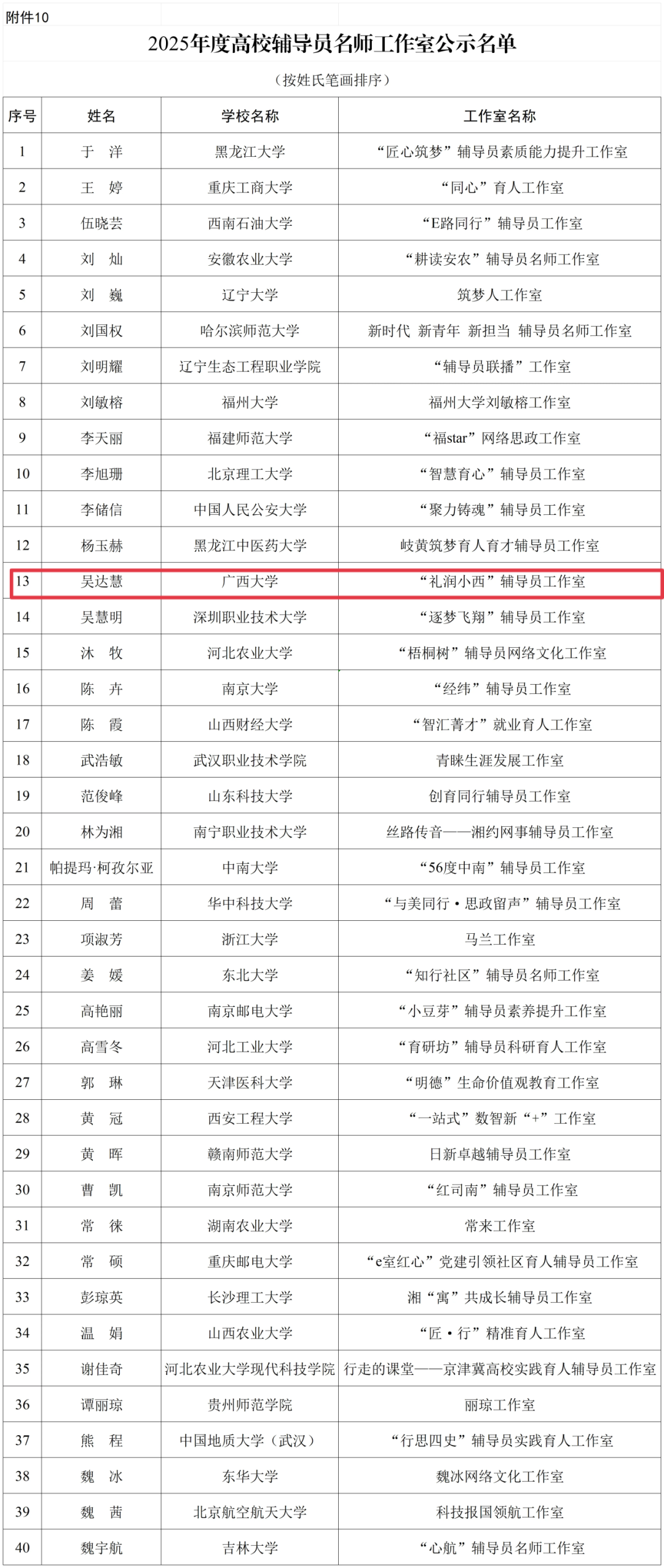 由我院党委常务副书记吴达慧主持的“礼润小西”辅导员工作室是首批广西高校高水平辅导员工作室。近年来,工作室坚持以美育人、以美化人、以美培元,始终围绕“资源整合为基础、点面结合为抓手、双线融合为途径、师生联合为保障”的“四合”建设思路,通过实施以打造一门《形象与礼仪》特色课程、组织一系列形象与礼仪实践活动、推出一批形象与礼仪宣讲作品、建成一个形象与礼仪育人阵地为内核的“四个一”工作举措,有效实现了用礼节礼仪润泽西大学子,将职业素养纳入人才培养全过程,引领学生树立正确的审美观念、陶冶高尚的道德情操、塑造美好心灵的良好效果。