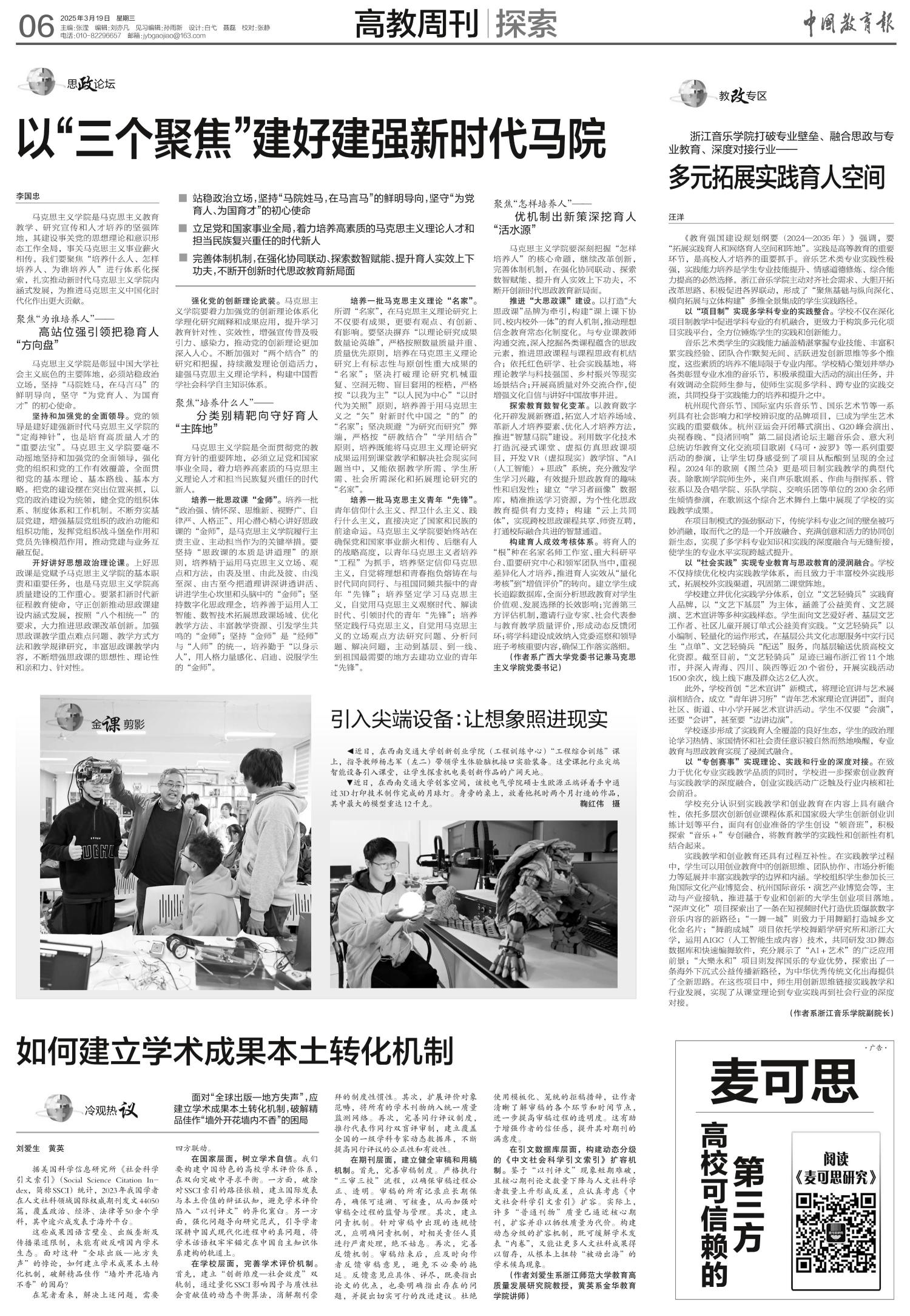 探索教育数智化变革。以教育数字化开辟发展新赛道,拓宽人才培养场域、革新人才培养要素、优化人才培养方法,推进“智慧马院”建设。利用数字化技术打造沉浸式课堂、虚拟仿真思政课项目,开发VR(虚拟现实)教学馆、“AI(人工智能)+思政”系统,充分激发学生学习兴趣,有效提升思政教育的趣味性和启发性;建立“学习者画像”数据库,精准推送学习资源,为个性化思政教育提供有力支持;构建“云上共同体”,实现跨校思政课程共享、师资互聘,打通校际融合共进的智慧通道。