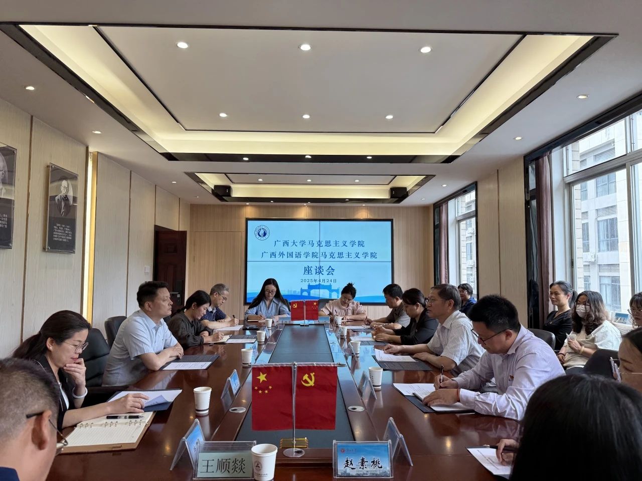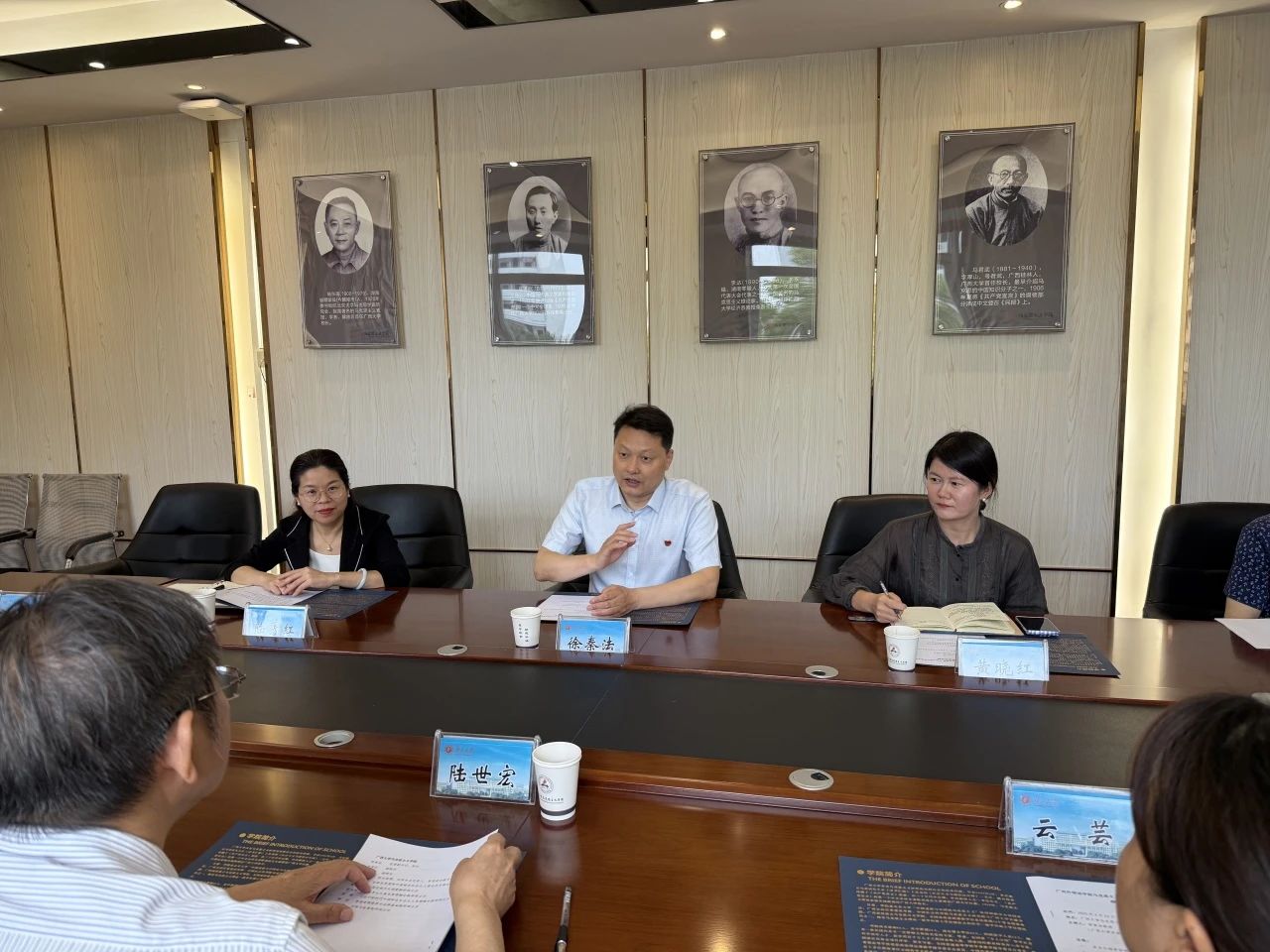 为推进学科交流合作,促进教育教学资源的共建共享,共同探索太阳成集团122ccvip高质量发展新路径,4月24日上午,广西外国语学院太阳成集团122ccvip院长陆世宏一行来我院调研交流。院长徐秦法、副院长陆秀红、副院长黄晓红、中国近现代史纲要教研部主任粟远辉等热情接待并参加座谈。双方围绕教师队伍建设、教学改革、学科建设以及人才培养等方面进行了深入的交流探讨。