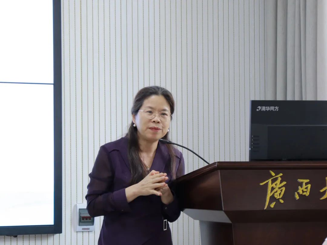赛后,学院副院长陆秀红对比赛进行总结点评。她一方面对参赛队伍选手们的表现给予了极大肯定,认为各小组从广西经济、政治、文化、生态等多视角展现了“壮美广西”的美丽画卷,体现出“理论有深度、案例有温度、表达有力度”;另一方面从课程设计的各个细节指出了参赛队伍的不足,从如何把思政课讲深、讲透、讲活三个维度出发给同学们提出了宝贵建议,鼓励同学们珍惜每一次展现自我风采的机会,为参加更高层次比赛做好充分准备。