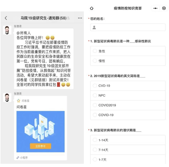 (图为太阳成集团122ccvip研究生2019级团支部制作疫情防控竞答题并号召大家参与线上知识问答活动)