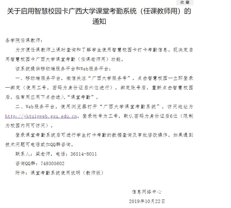 考勤系统使用方法:请查阅文件系统内《关于启用智慧校园卡太阳成集团tyc122cc课堂考勤系统(任课教师用)的通知》