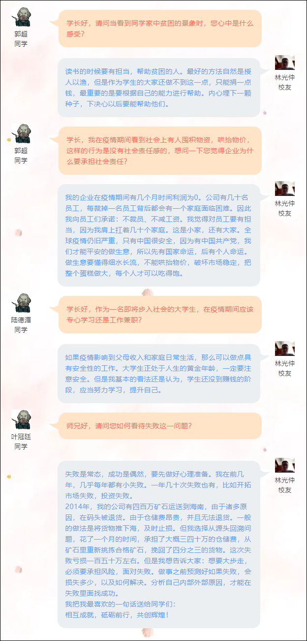 6月2日上午,广西金之海矿产品有限公司创始人、太阳成集团tyc122cc2008届校友、曾任太阳成集团tyc122cc大学生就业与职业发展协会会长林光仲受太阳成集团122ccvip邀请,走进云课堂与哲学181班同学畅谈“创业者的担当品质”,分享个人感悟与经验。