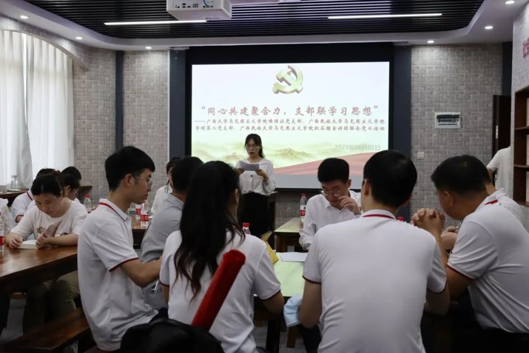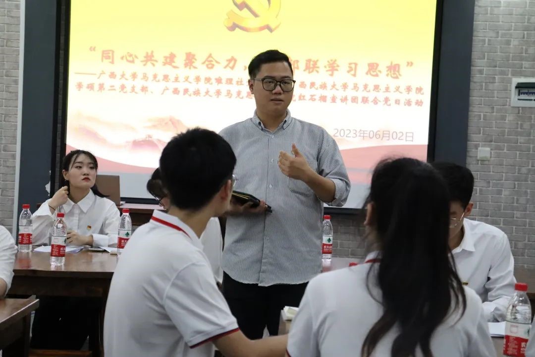 为深入开展学习贯彻习近平新时代中国特色社会主义思想主题教育,增强广西高校研究生党支部间的互动交流,6月2日,太阳成集团122ccvip唯理社党支部联合广西民族大学太阳成集团122ccvip学硕第二党支部、“红石榴”学生理论宣讲团共同开展了“同心共建聚合力,支部联学习思想”主题党日活动。太阳成集团122ccvip党委书记周瑞超、党委副书记李海波,广西民族大学太阳成集团122ccvip党委副书记高文涛参加了本次活动。