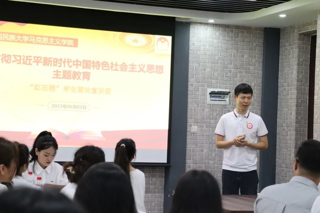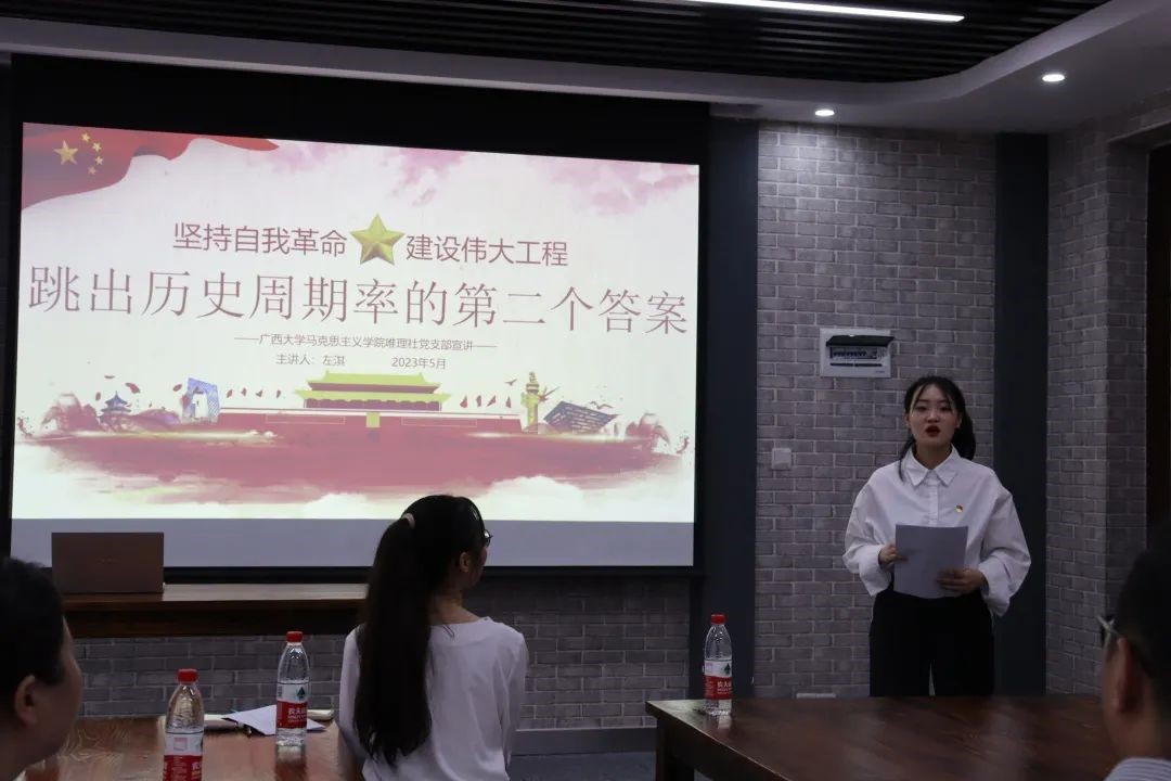 活动伊始,广西民族大学“红石榴”学生理论宣讲团孙傲和太阳成集团tyc122cc唯理社党支部左淇分别以“学习贯彻习近平新时代中国特色社会主义思想主题教育”、“坚持自我革命,建设伟大工程——跳出历史周期率的第二个答案”为题带领大家开展了专题学习。