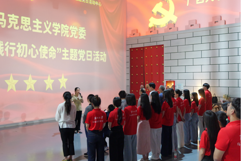 全体党员在学院党委常务副书记吴达慧的带领下重温了入党宣誓仪式,并观看“回望广西这百年”红色短片。活动中心通过锦绣大屏及动态长卷等高科技手段,为党员们展示广西伟大历史事件和英雄先驱的事迹,让党员同志们身临其境地体会了湘江战役的惨烈战况,深刻感受了红军战士勇于战斗、不怕牺牲的斗志和自强不息的民族精神。