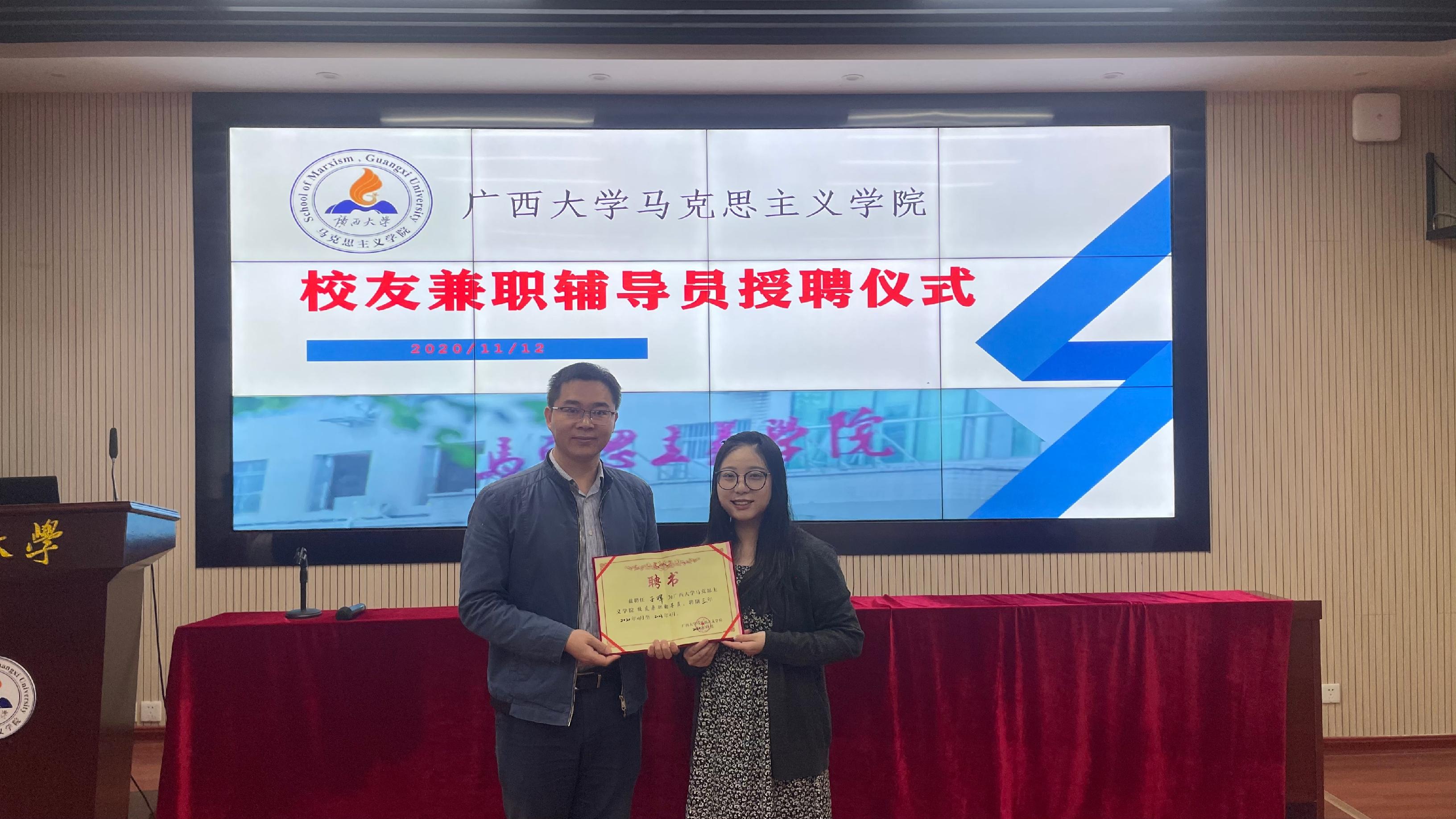 11月12日,我院优秀校友于晖受聘担任我院校友兼职辅导员,授聘仪式在我院101报告厅举行,院党委副书记李海波老师为其颁发聘书。