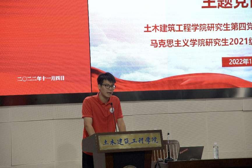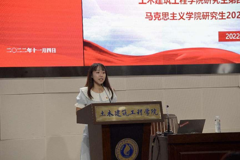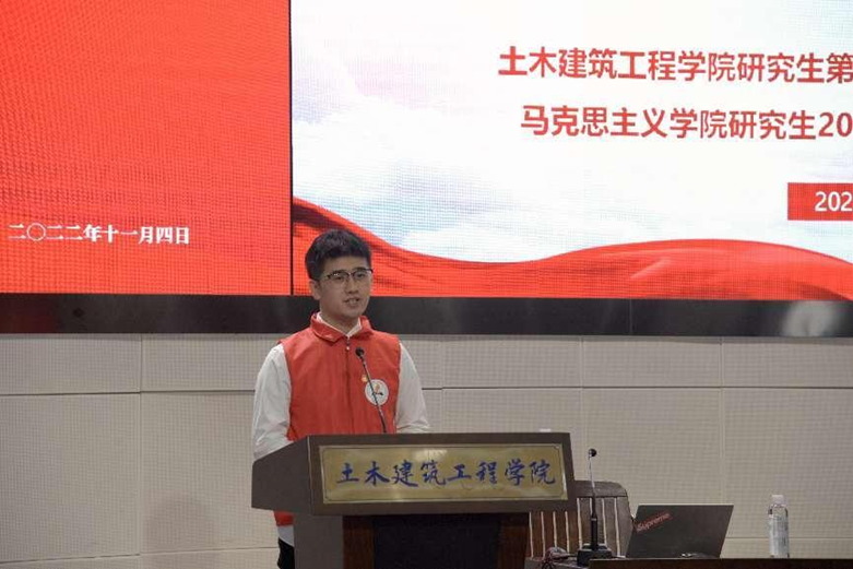 在交流分享环节,我院研究生2021级党支部副书记蒋毅、土木建筑工程学院研究生第四党支部党员刘妙青分别作为两院学生党员代表,就学习宣传贯彻党的二十大精神进行了专题分享。